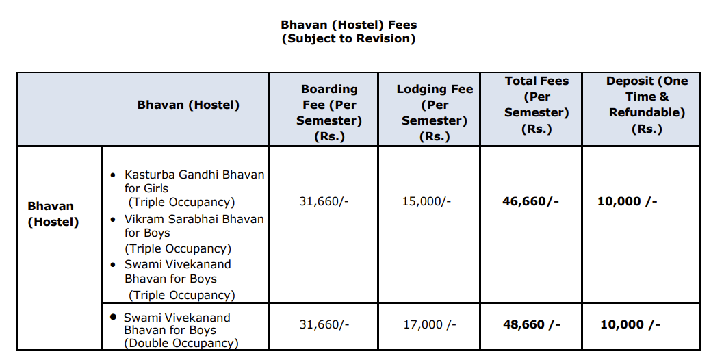 The hostel at GSFC University offers separate facilities for boys and girls, with two boys' hostels and one girls' hostel. Each hostel is three stories high, accommodating approximately 50-60 rooms. Rooms are shared by three students, providing a bed, study table, chair, and attached bathroom for each occupant. Additional amenities include a washing machine on each floor, exercise equipment, and a common area for games. The hostel charges are 80,000 INR per annum with a 10,000 INR refundable deposit, plus a mess fee of 17,000 INR per semester.