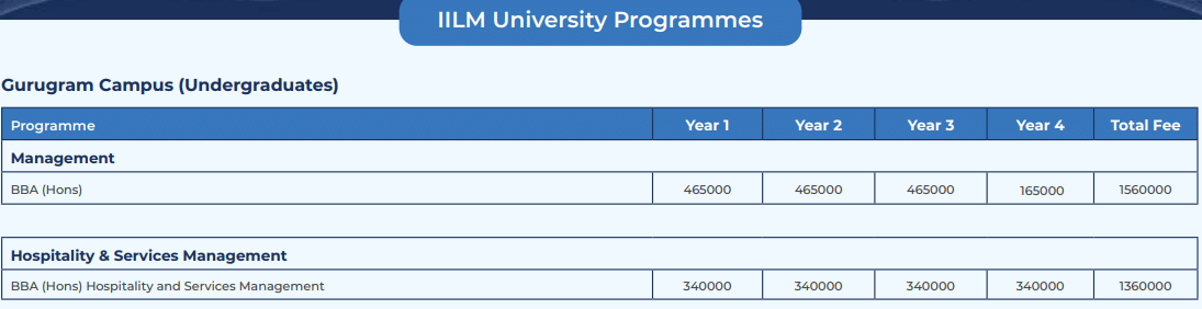 Earlier, BBA {Hons.} fees at IILM University Gurgaon was ₹ 18.6 Lakhs (in 2025) for the entire course duration. This shows that the fee has remained unchanged since 2025.