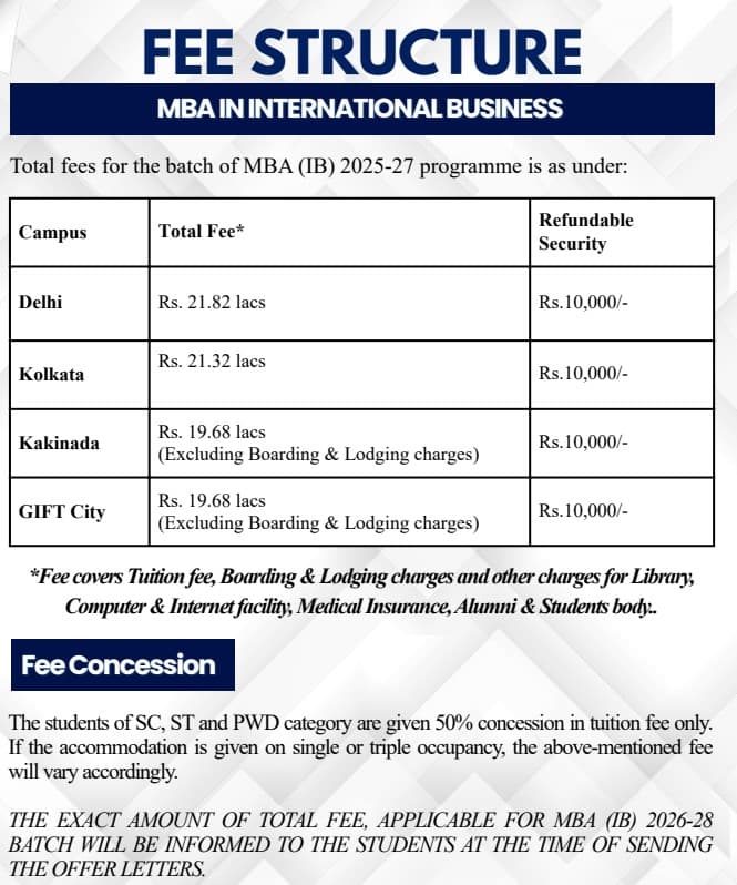 Earlier, BBA + MBA fees at IIFT Kakinada was ₹ 29.7 Lakhs (in 2022) for the entire course duration. This shows a fee decrease of ₹ 6.02 Lakhs over the year.