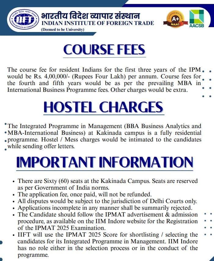 Find detailed IIFT Kakinada BBA + MBA fees, eligibility, admission dates, cutoff and ranking below.